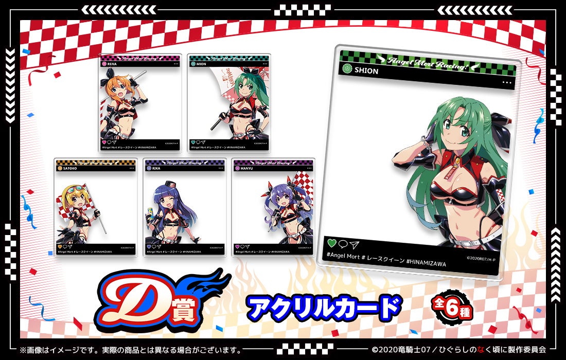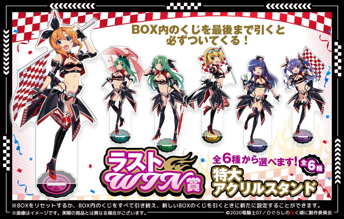 The 10th installment in the Web Lottery series features Higurashi: When They Cry – SOTSU merchandise. This new lottery showcases a "race queen" theme inspired by Angel Mort, with all-new illustrations of six characters drawn by character designer Akio Watanabe.