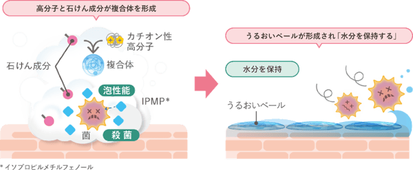 When rinsing, soap components combine with the cationic polymer moisturizing ingredient to form a moisturizing complex that easily adheres to skin. This "moisturizing veil" remains on the skin after washing, providing both effective cleansing and lasting hydration for soft, conditioned hands.