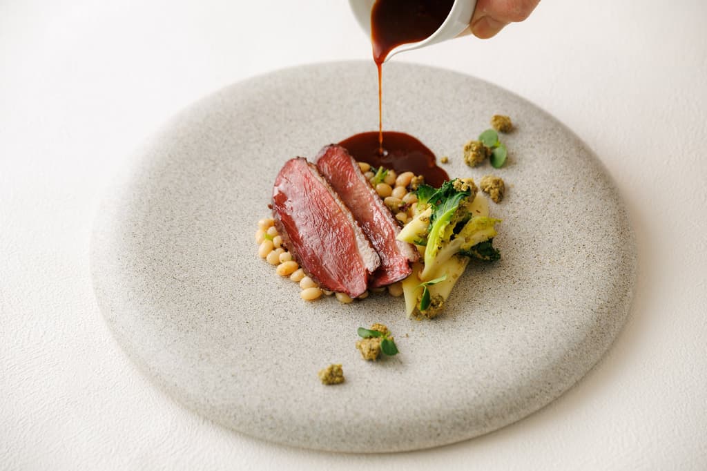 Drawing inspiration from the French classic quatre-épices (four spices: pepper, nutmeg, ginger, and clove), Chef Kamo developed his own original seven-spice blend. Sun-dried organic white pepper sourced from Cambodia, cardamom, star anise, clove, coriander, nutmeg, and cinnamon are combined with the rich depth of Magret duck. Mint is added to the white bean garnish, while a homemade chive salt is folded into the crumble scattered over the dish — giving the wild, robust flavors of the duck a modern, lighter finish.