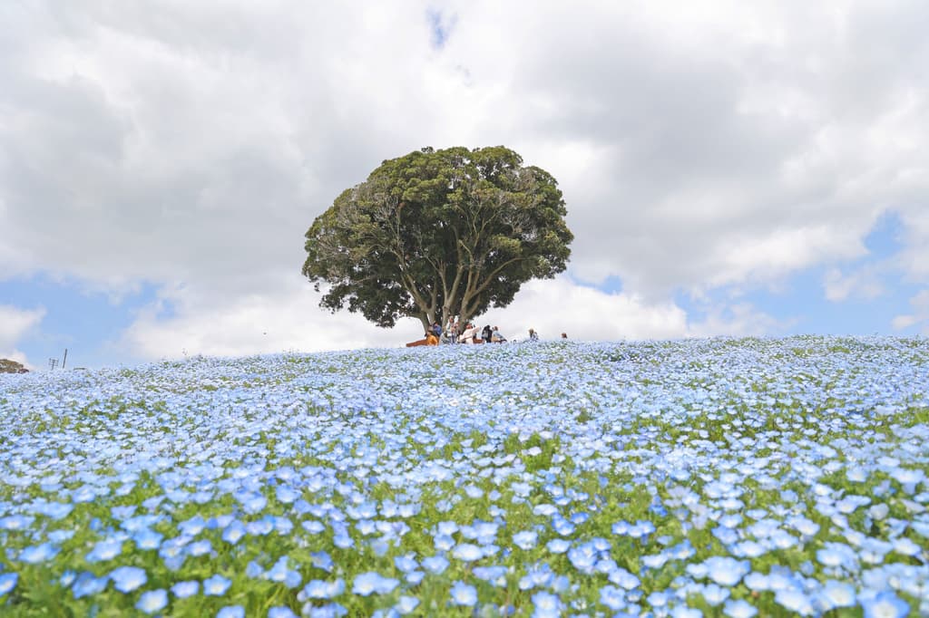 Situated approximately 300 meters above sea level, the hilltop farm offers unobstructed views of the sky paired with a sweeping carpet of blue nemophila below.