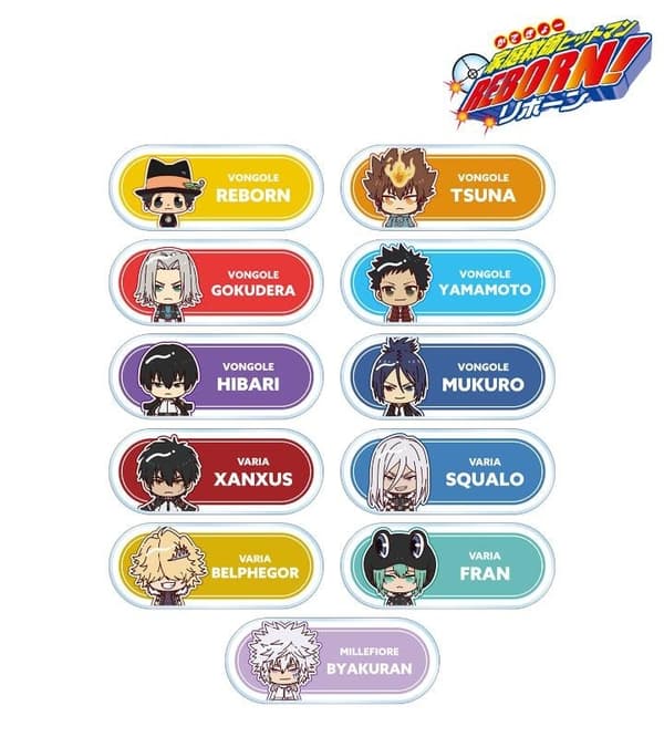 - Varieties: 11 types [Reborn, Tsunayoshi Sawada, Hayato Gokudera, Takeshi Yamamoto, Kyoya Hibari, Mukuro Rokudo (10 years later), XANXUS (10 years later), Superbi Squalo (10 years later), Belphegor (10 years later), Fran, Byakuran]