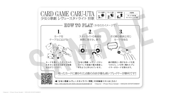 CARU UTA is a card game played by actually singing or playing songs. When a lyric is sung—for example, "I love you~"—players race to grab matching word cards laid out on the table. The series has surpassed 120,000 copies sold in total across previous releases and has previously collaborated with artists such as Porno Graffitti and the franchise Ensemble Stars!. The game is enjoyed by players of all ages.
