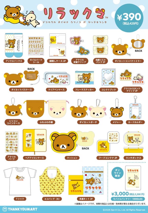 Rilakkuma, the beloved character from San-X, is making its first-ever appearance at THANK YOU MART, the "kawaii" character goods shop where everything is priced at 390 yen. The limited Rilakkuma items will go on sale at THANK YOU MART stores nationwide from late April 2026, with stock arriving at each location.
