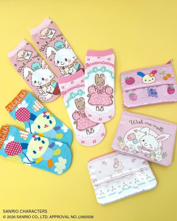 The collection includes 32 items total, all designed with the charming aesthetic of Wish me mell, Usahana, and Marron Cream in seasonal spring tones. The lineup covers a wide range of everyday and gift items, including pouches, bag charms, message cards, and hair ties.