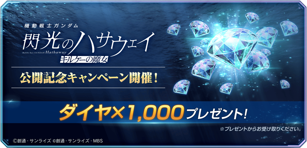 To celebrate the release of Mobile Suit Gundam Hathaway: The Sorcery of Nymph Circe, 1,000 diamonds are being distributed!
