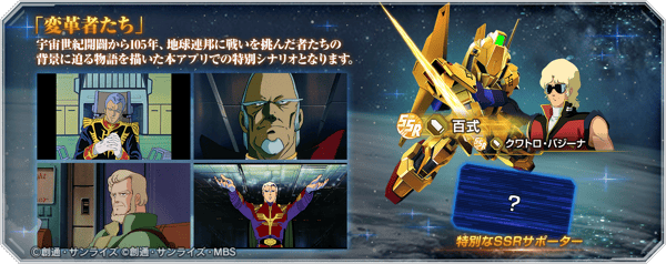 Clearing "Revolutionaries" rewards players with the SSR unit "Hyaku Shiki," SSR character "Quattro Bajeena," and a special supporter commemorating the currently screening Mobile Suit Gundam Hathaway: The Sorcery of Nymph Circe.