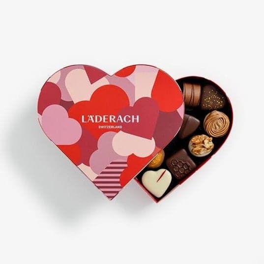 Un surtido de lujo que incluye chocolates de San Valentín de temporada. FrischSchoggi (chocolate roto) y otros productos pesados también están disponibles, ofreciendo una nueva forma de disfrutar del chocolate en el lugar.