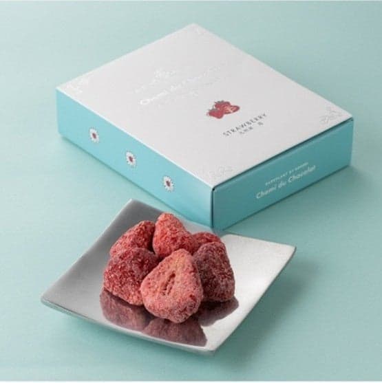 Las fresas producidas en Kyushu se liofilizan enteras y se infunden con chocolate blanco. La apariencia es de fresa, pero cuando se consume, es chocolate.