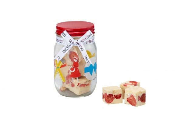 Chocolate blanco mezclado con fresas liofilizadas, almendras tostadas y masa de langue de chat. El sabor agridulce de la fresa es un chocolate irresistible.