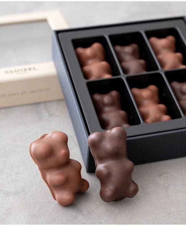 Guimauves esponjosas con forma de oso recubiertas con chocolate negro al 63% y chocolate con leche al 39%.