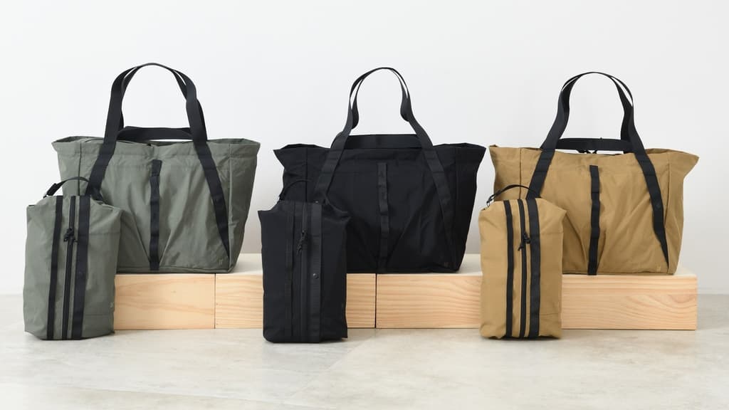 Ambos artículos utilizan una tela ripstop de nylon ligero con un acabado lavado (arrugado) que hace que los pliegues sean menos visibles. También se aplica un tratamiento repelente al agua, lo que los hace adecuados para usar incluso en días lluviosos. La colección está disponible en tres colores: Khaki, Camel y Negro.