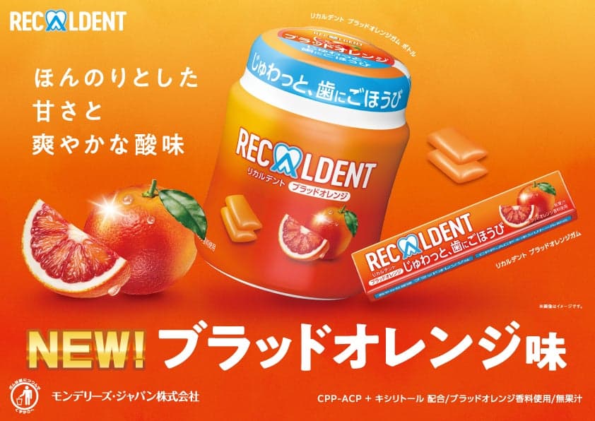 Un nuevo sabor a naranja sanguina se une a la línea de gomas de mascar Recaldent. Mondelez Japón lanzará "Recaldent Naranja Sanguina" a nivel nacional en tiendas minoristas a partir del lunes 16 de marzo de 2026.