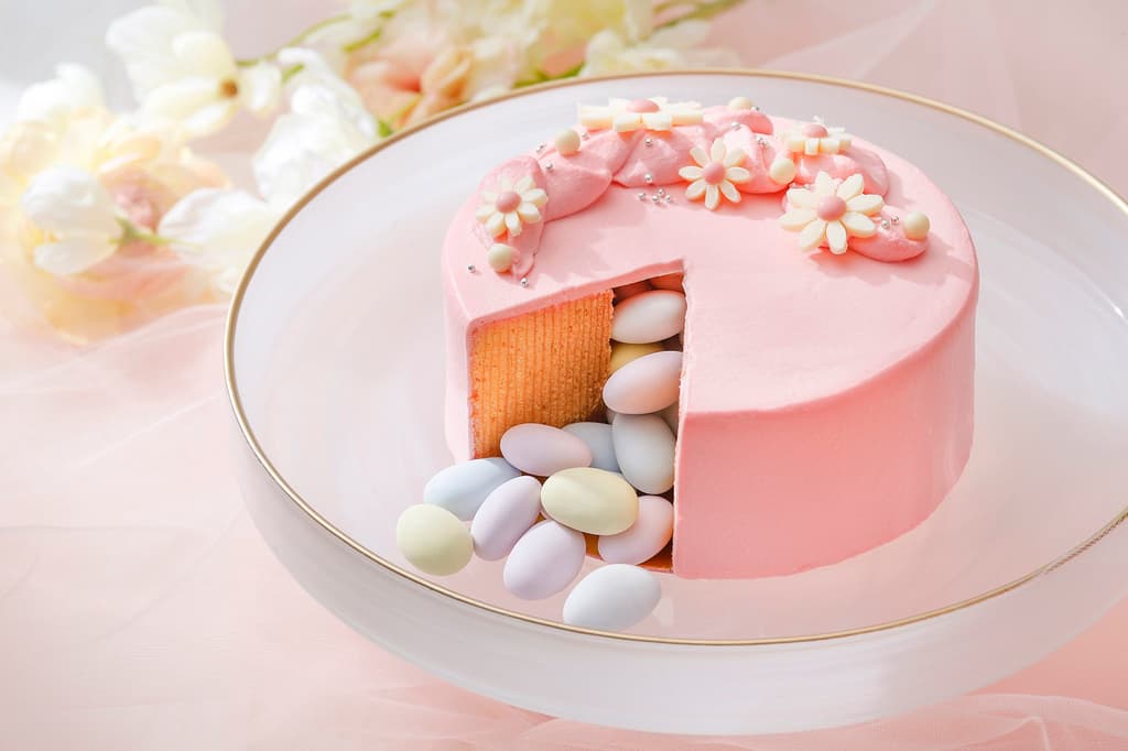 El pastel está diseñado con una estética suave y delicada: crema de color rosa pálido adornada con flores de primavera. El verdadero deleite llega al cortarlo: grageas de colores pastel que se asemejan a huevos de Pascua se derraman desde el centro, creando un momento fotogénico y divertido. En el interior, el pastel está hecho con un Baumkuchen húmedo, lo que lo hace agradable para huéspedes de todas las edades, desde niños hasta adultos.