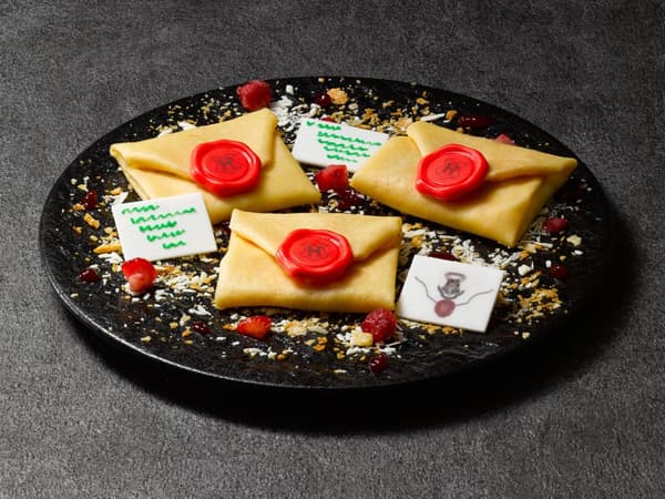 Tres crepes con forma de carta en sabores de leche de fresa, plátano con chocolate y tiramisú recrean la avalancha de cartas de aceptación de Hogwarts que llegan a casa de Harry.