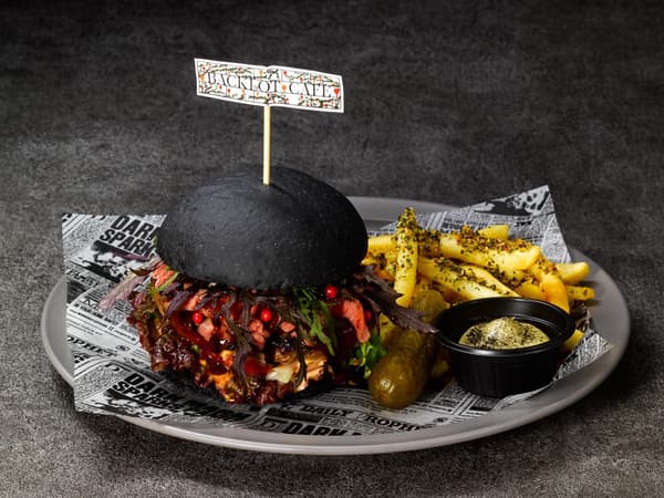 La salsa aioli negra, la salsa de crema balsámica y la hoja de tomate negro recrean la atmósfera misteriosa del Bosque Prohibido. Las patatas fritas con especias y hierbas con un rico aroma completan el plato.