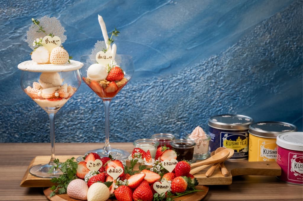 Bagian tengah piring menampilkan dua parfait - satu menampilkan stroberi merah (varietas Benihopppe) dan yang lainnya menyoroti stroberi putih. Di sekelilingnya terdapat empat stroberi bermerek premium: Amaou, Kotoka, Yumenoka, dan Tochiotome.