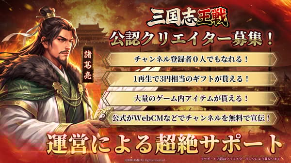 Romansa Tiga Kerajaan: King's War, sebuah game simulasi strategi MMO baru untuk smartphone yang dikembangkan dan dioperasikan oleh Hong Kong Black Beard Game Co., Ltd. (BBGame), secara resmi diluncurkan di Jepang pada 2 April. Dibangun di sekitar sejarah era Tiga Kerajaan, judul ini menarik lebih dari 500.000 pra-registrasi sebelum ditayangkan.