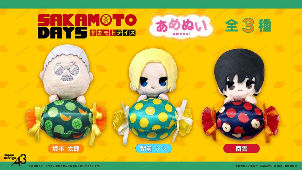 Tiga karakter dari anime TV Sakamoto Days telah bergabung dalam seri plush original "Amenui" oleh A3. Lineup — Sakamoto Taro, Asakura Shin, dan Nagumo — mulai dijual di eeo Store online sejak 2 April 2026.