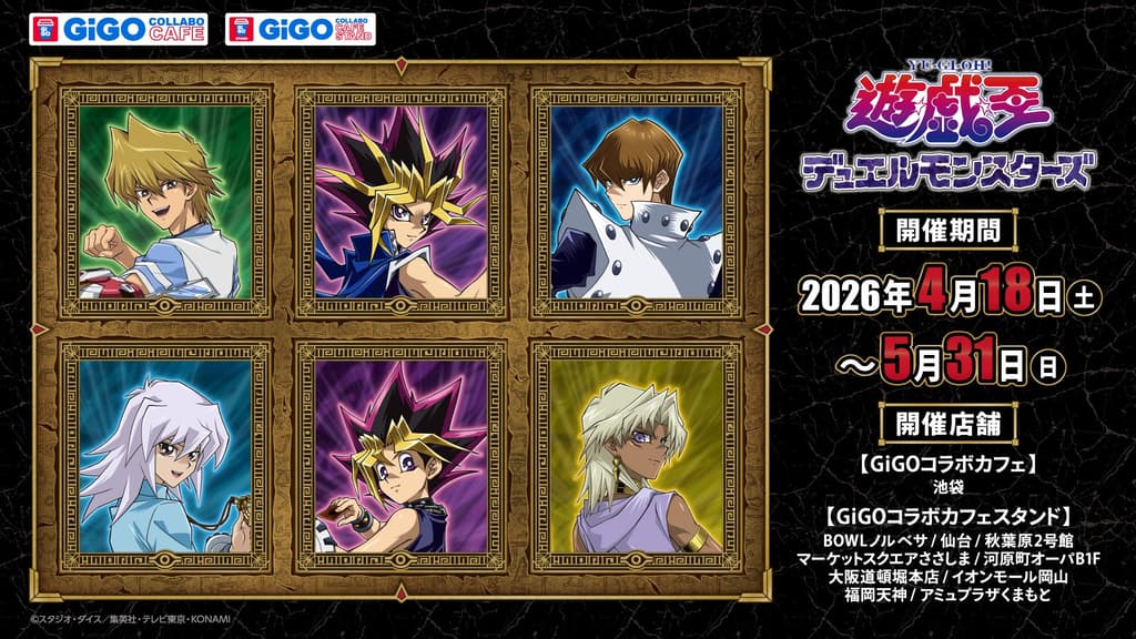 Event kolaborasi Yu-Gi-Oh! Duel Monsters akan hadir di toko-toko GiGO seluruh Jepang mulai 18 April 2026 (Sabtu). Event ini menampilkan ilustrasi baru bertema "punggung seorang duelist" yang digunakan pada hadiah eksklusif dalam toko, menu kafe kolaborasi, merchandise orisinal, taiyaki kolaborasi, dan minuman spesial.