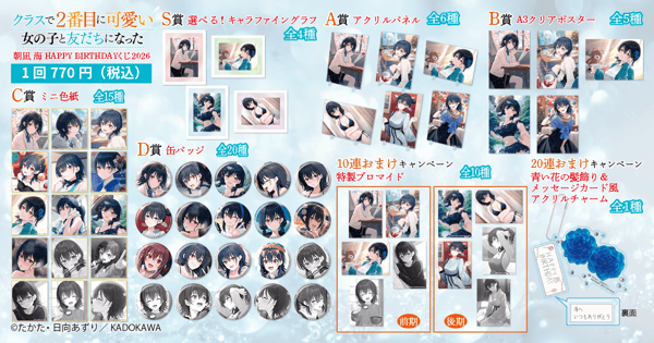 KADOKAWA에서 운영하는 온라인 복권 서비스 “쿠지비키도”에서 『우리 반에서 제일 예쁜 애랑 사귀게 된 썰』 아사나기 우미 HAPPY BIRTHDAY 복권 2026을 2026년 4월 3일(금) 12:00부터 판매 개시합니다. 주인공 아사나기 우미를 중심으로 일러스트레이터 아즈리 히나타가 새롭게 그린 일러스트를 사용한 호화로운 상품이 준비되어 있습니다.