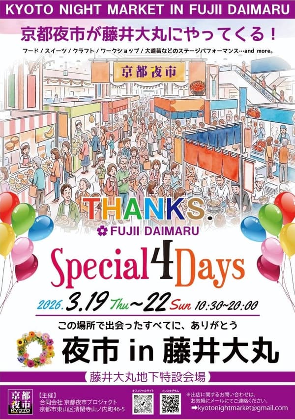 교토 최대 규모의 야시장 중 하나로 누적 방문객 10만 명을 맞이한 교토 요이치(京都夜市)가 2026년 5월 리모델링을 위한 폐점을 준비 중인 오랜 역사의 백화점인 후지이 다이마루에서 처음으로 개최됩니다. 장소는 평소 백화점 식품관으로 사용되는 지하 1층 특별 이벤트 공간으로, 교토 야시장 문화의 에너지를 실내로 가져와 "데파치카노 엔니치(백화점 지하 축제)"로 펼쳐집니다.