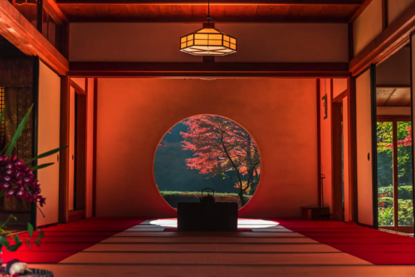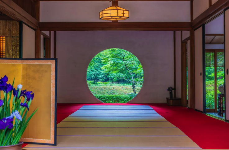 ‘수국 사찰’로 알려진 이곳의 둥근 창문은 살아있는 그림처럼 계절별 풍경을 담아냅니다.
