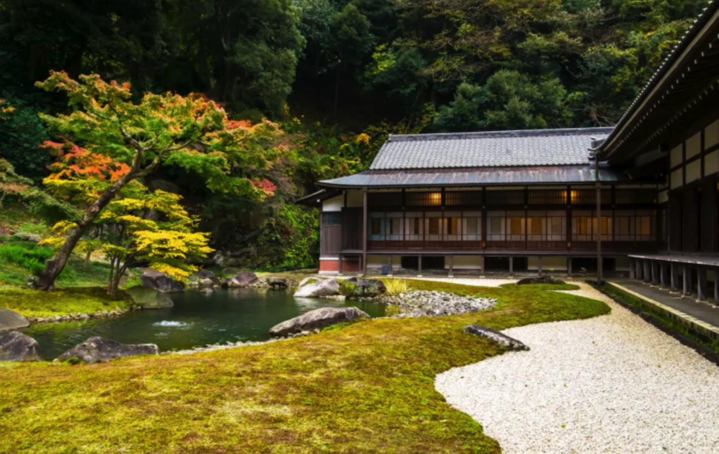 넓은 전망, 이끼 정원, 계곡을 통해 울려 퍼지는 거대한 종소리가 특징인 웅장한 선 사찰입니다.
