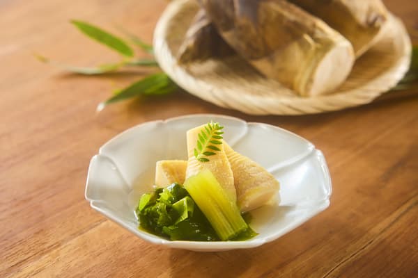 หน่อไม้จากเกียวโต สาหร่ายวากาเมะจากนารุโตะ และฟุกิ (บัตเตอร์เบอร์) ในประเทศ นำมาต้มซอสในครัวของร้านเอง ความกรอบของหน่อไม้และความนุ่มเนียนของสาหร่ายวากาเมะผสมผสานกันได้อย่างลงตัว