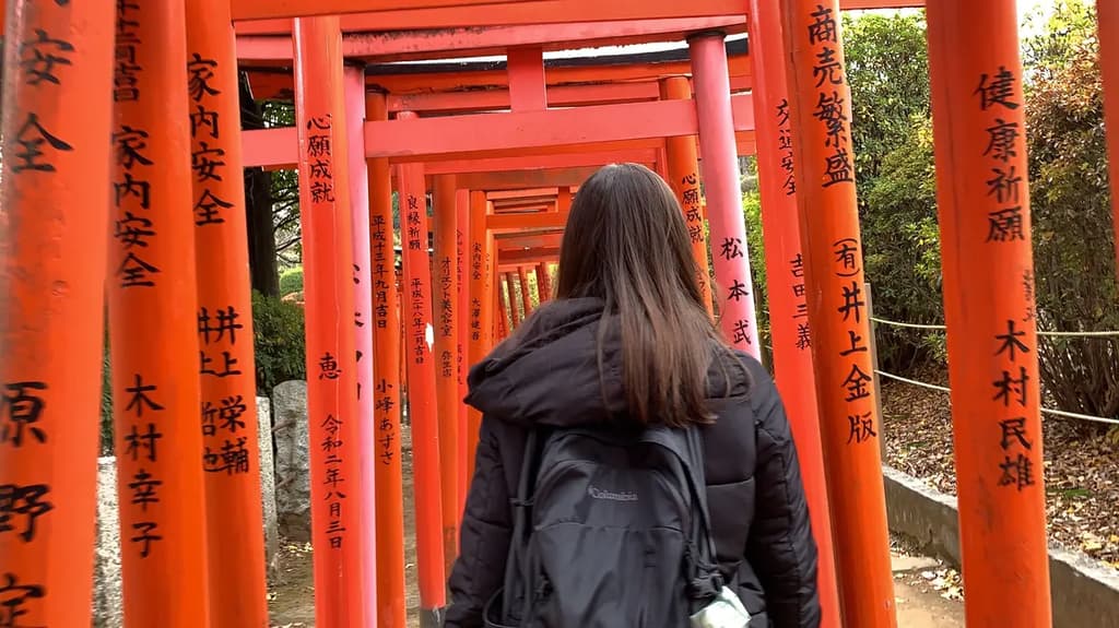 享用完乌冬面后,我们来到根津神社进行初诣!根津神社内有鸟居。我们惊喜地发现在东京也有鸟居!一排排红色鸟居的景象真是令人惊叹。