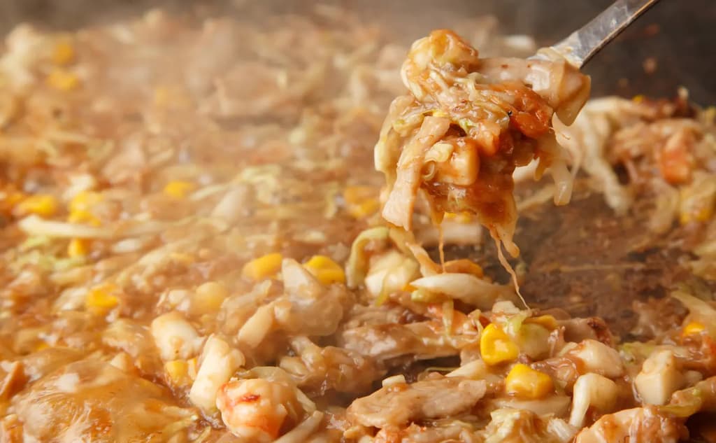 配料因地区和餐厅而异,有时包括零食面条、年糕、奶酪、鳕鱼子、猪肉、虾和炒面。