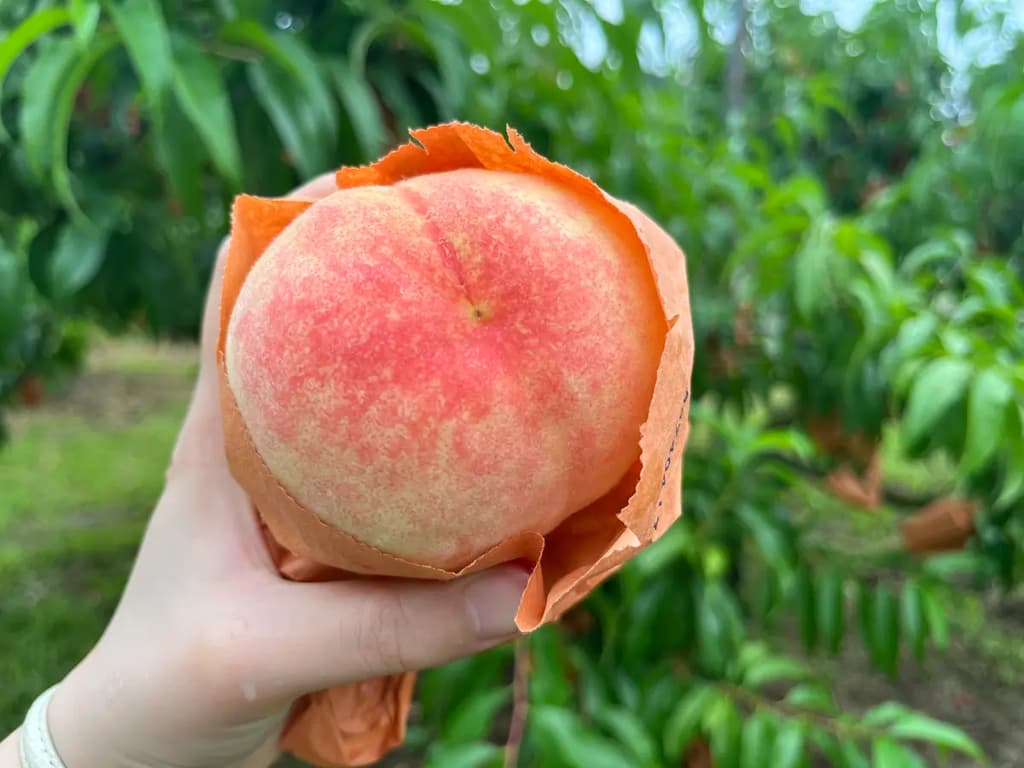 到达冈山县赤磐市的农场。我们预订了"2个白桃采摘+2个品尝"体验计划。所需时间为60分钟!