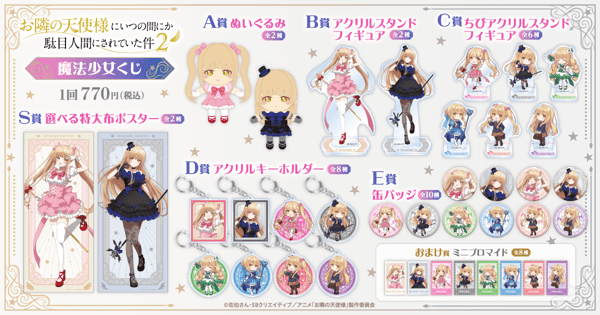 以《住在我家隔壁的天使大人2》为主题的线上抽奖活动即将通过「くじびきどう(Kuji-Biki-do)」线上抽奖服务正式开启。「住在我家隔壁的天使大人2 魔法少女くじ」将于2026年4月16日(周四)中午12:00开始发售。