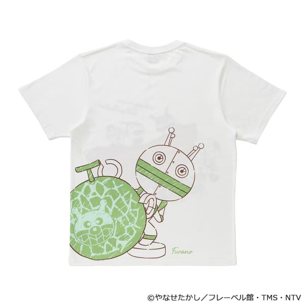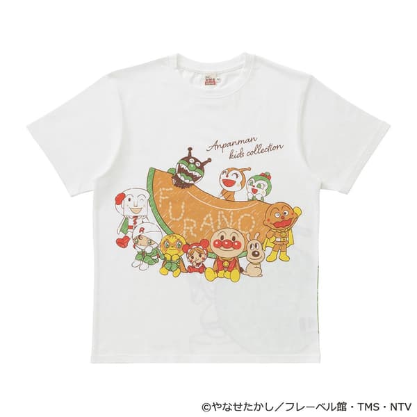 这款T恤采用了富良野特产哈密瓜作为设计元素。面包超人与伙伴们围绕在多汁的哈密瓜周围,采用了满版印花设计,其中“FURANO”字样巧妙地由哈密瓜籽拼成,增添了浓郁的地域特色。背面则是从哈密瓜里探出头来的骷髅人(Dadandan),仔细观察还能发现细菌人躲在瓜皮中。成人款为米白色,儿童款为黄色,非常适合亲子穿搭。