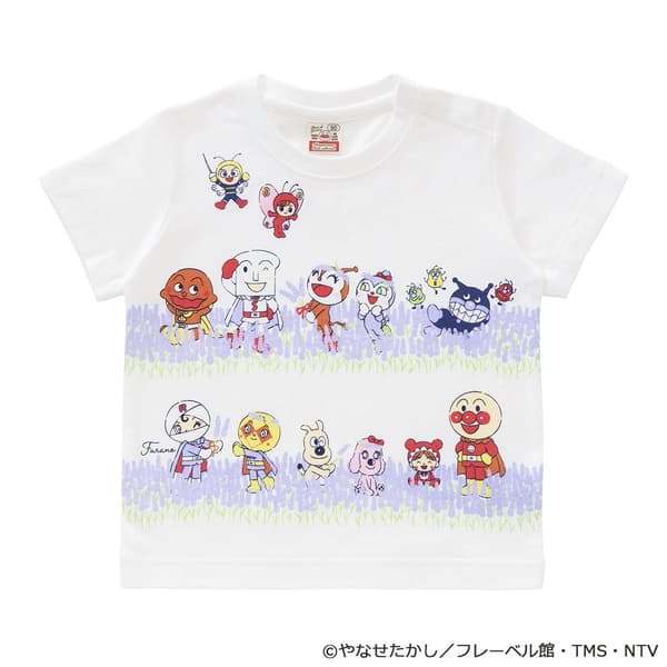 这款T恤的设计灵感源自富良野标志性的薰衣草花田。满版印花呈现了面包超人、细菌人、红精灵、蓝精灵以及其他伙伴们在薰衣草中嬉戏的场景。背面印有由薰衣草花朵构成的“FURANO”字样,旁边还有骷髅人(Horrorman)的设计。
