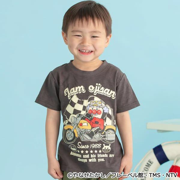 这款T恤采用了果酱爷爷(Jam Ojisan)骑着摩托车的醒目图像。选用竹节棉面料,营造出轻松休闲的质感。提供成人与儿童款式,可供亲子搭配。