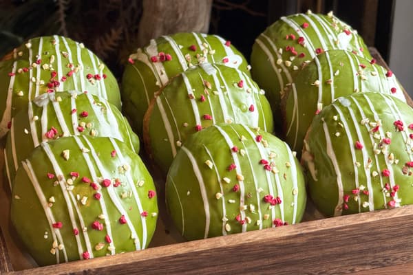 风味浓郁的抹茶融入自制卡仕达奶油中,并大量填充到受欢迎的生贝果甜甜圈中。外面裹上抹茶白巧克力,并撒上干燥的覆盆子和杏仁丁。