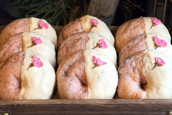 这款春季美食以樱花装饰和黄豆粉巧克力涂层为特色。耐嚼的贝果面团揉入腌制樱花叶,并填充来自会津若松的红豆馅,然后烘烤完成。