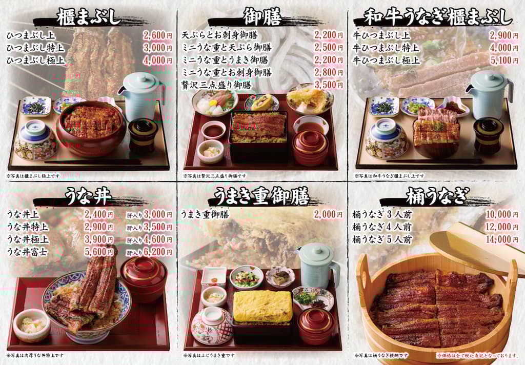 富士山餐厅提供的不仅仅是标准的鳗鱼饭(unagidon)和鳗鱼三吃(hitsumabushi,名古屋风味的鳗鱼盖饭)。现在的菜单包括全套套餐(gozen)、新的招牌菜,如“桶鳗”(家庭式鳗鱼拼盘)和“和牛鳗鱼三吃”(高级牛肉鳗鱼三吃),以满足更广泛的用餐者。