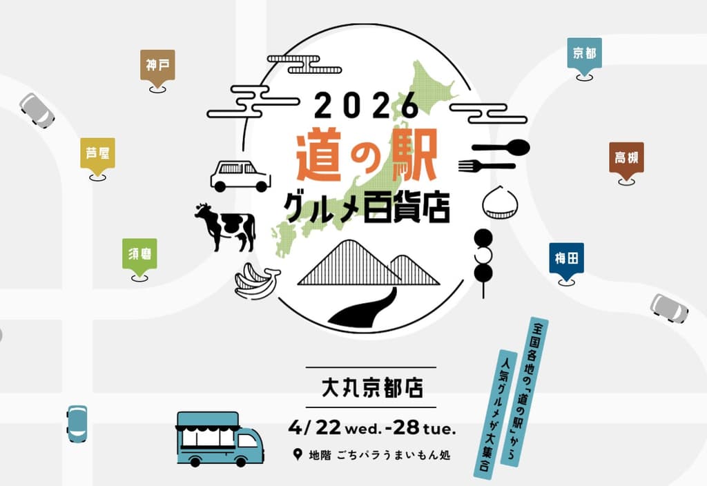 "2026年道之驿美食百货商店"集市首次亮相大丸京都,汇聚了来自日本各地道之驿(Michi no Eki)的特色美食。活动将于**2026年4月22日(周三)至4月28日(周二)**举办,地点为大丸京都地下一楼"美食天堂·吃货角"区域。