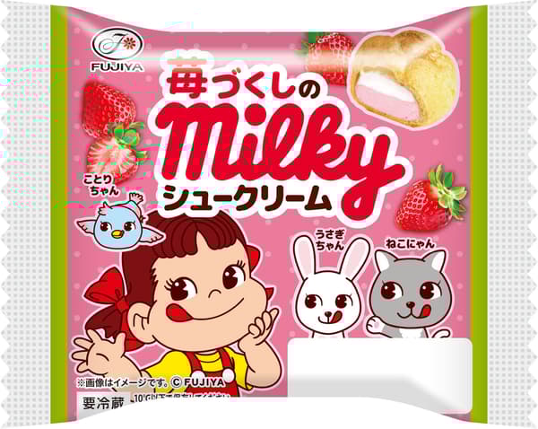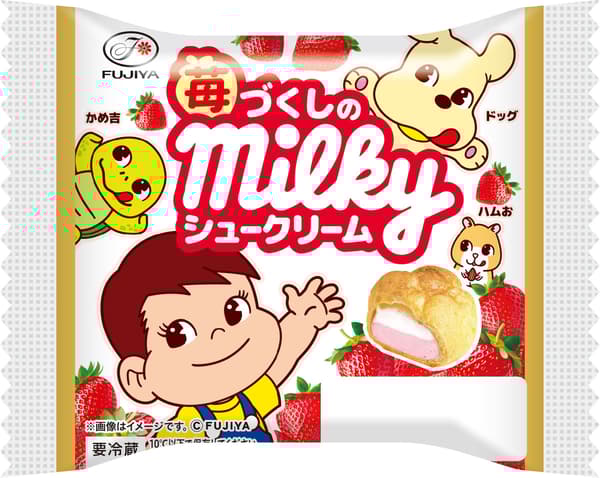 这款奶油泡芙融合了两种口味:草莓奶油和牛奶奶油。包装上首次出现了这些新角色,共有4种款式。尽情享受酸甜草莓和柔滑牛奶的美味组合,以及有趣的插图。