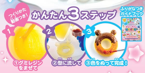 包装盒内包含了从第一天起制作所需的所有材料:软糖树脂、着色墨水以及该套装专属的原创塑料模具。无需额外购买任何工具,收到套装即可立即开始创作。