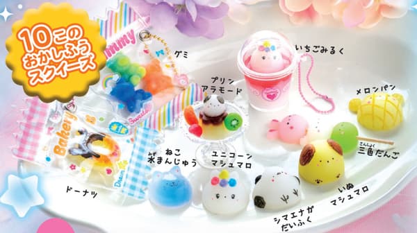 该套装包含10种不同设计,造型融入了日式甜点和各种甜品的动物元素,包括长尾山雀大福、猫咪果冻水信玄饼以及独角兽草莓牛奶饮品。
