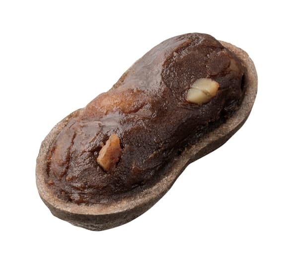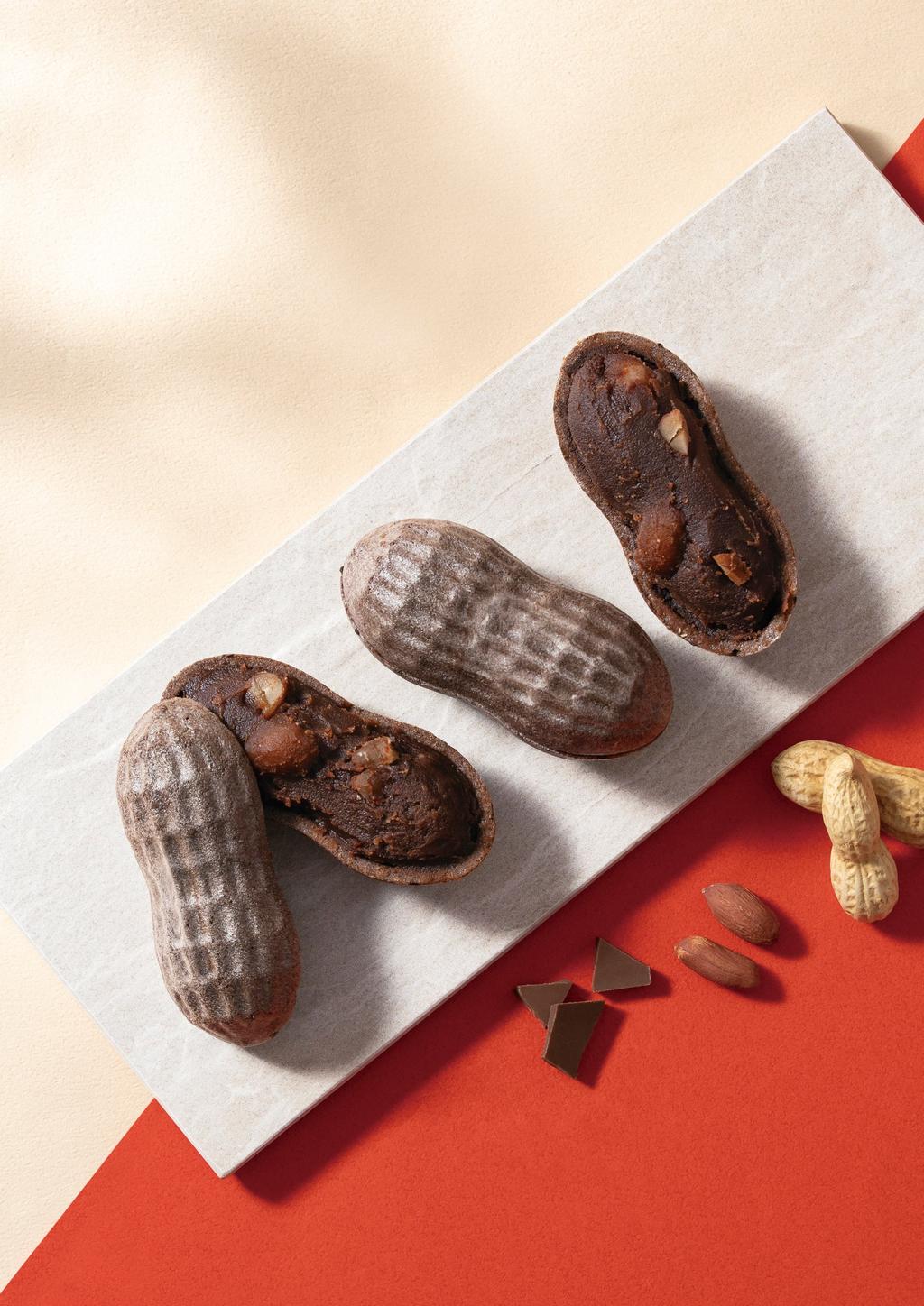 巧克力花生最中将甜煮花生泥与巧克力融合,制成细腻浓郁的内馅,再以加入可可粉的最中饼皮夹裹。巧克力的香味清晰呈现,花生的温和风味紧随其后。以可可粉制成的最中饼皮还带有一丝香脆的烘烤气息,将两种风味完美融为一体。
