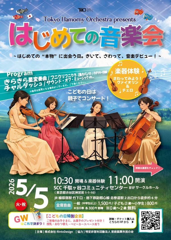 "Hajimete no Ongakukai"(初次音乐会)的黄金周特别场次将于2026年5月5日(周二·法定节假日)在东京都涩谷区神宫前1-1-10 SCC千驮谷社区中心B1F社区大厅举行。本次古典音乐会由东京和声管弦乐团演出,专为家庭设计,从出生起的婴幼儿均可入场。门票可通过Confetti购买。