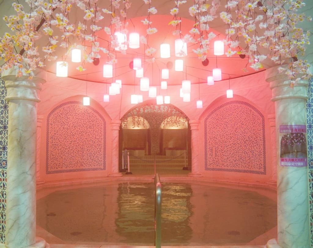 廣受歡迎的季節性浴池「鴨之花筏浴」重返室內「土耳其浴場」區。約3,000隻橡膠小鴨玩具漂浮在水面上,而40盞櫻花色燈籠則在頭頂投射出柔和的粉紅色光芒——讓人聯想到櫻花花瓣在河上漂流的感覺。YUNESSUN(泳裝浴區)內允許攜帶相機和智慧型手機,使其成為拍照的絕佳地點。