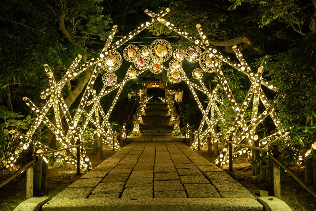“花灯”是一项日式灯光展,整个公园都被柔和的光线所笼罩,这些光线来自竹灯笼和优雅的树木、花卉及文化财产照明。今年推出了几个新景点,包括“灯花大轮”和“和灯之橹”。升级版再次由竹灯笼制作团体CHIKAKEN创作,该团体旨在与自然共生。