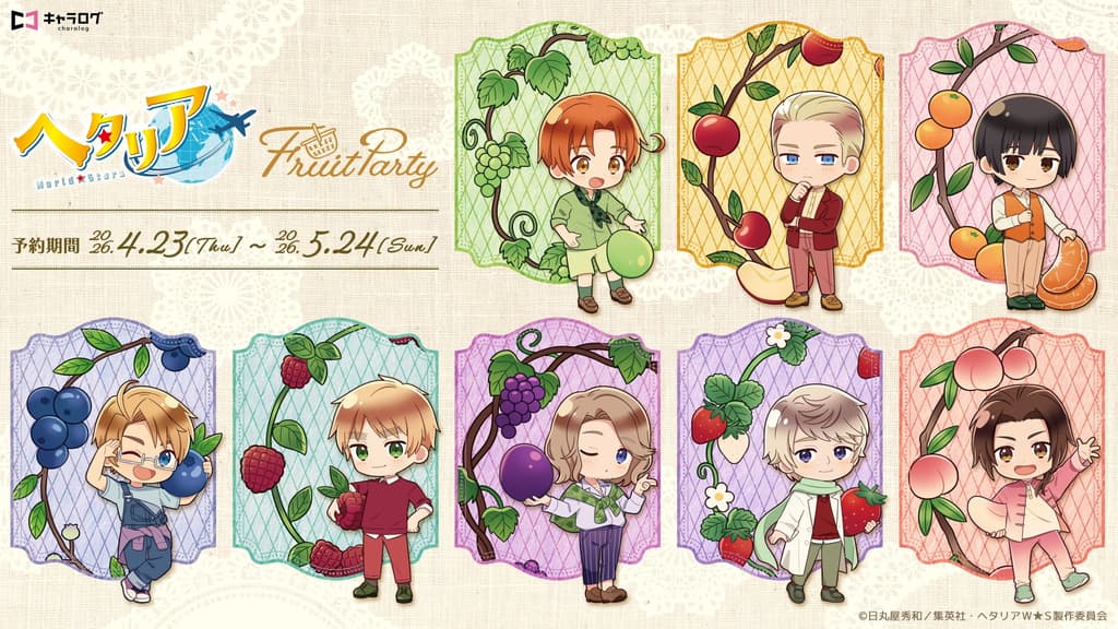 以动画《黑塔利亚 World★Stars》为主题的全新系列周边商品——“黑塔利亚 World★Stars ~水果派对~”现已开启预售。本次商品阵容采用了全新绘制的Q版角色插画,并且是Chara-log首次推出的独家原创服装设计。预售已于2026年4月23日中午12:00正式开启。
