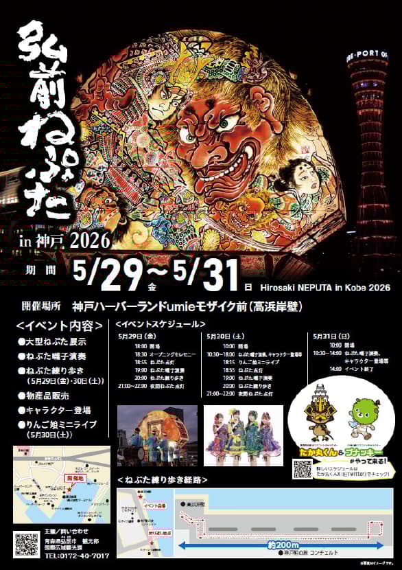 "弘前睡魔灯笼节(神户)2026"(2026年5月29日至31日,由弘前市主办)是自2022年起每年举办的宣传活动,旨在吸引关西地区的游客,今年已是第五届。