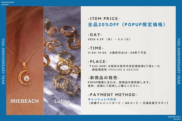 为纪念成立10周年,饰品品牌IRIEBEACH及其姐妹品牌Lufine将在大阪南船场联合举办快闪活动。活动仅持续8天,从2026年4月29日至5月6日——提供了一个难得的机会,让顾客可以亲自观看和触摸他们的产品,因为这两个品牌主要通过其在线商店运营。