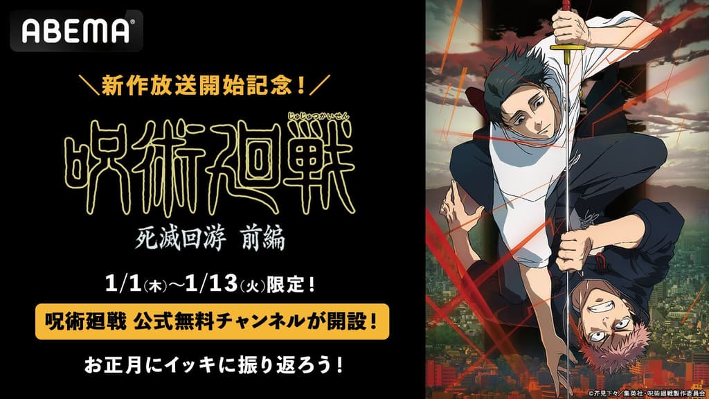 ABEMA新开设的「咒术回战」官方免费频道将于2026年1月1日(周四)至1月13日(周二)的13天内,连续免费播出全部47集TV动画以及「咒术回战0」。